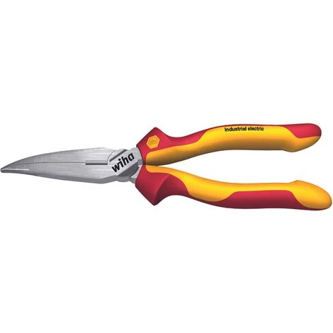 Ces pinces à becs longs courbés Industrial de Wiha conviennent pour saisir et maintenir des fils et câbles souples et durs. Vous pouvez également couper des câbles souples et durs avec ces pinces à bec long. La forme de la mâchoire de ces pinces est légèrement pliée à environ 40 °. Les pinces à bec long ont un tranchant extra long et des mâchoires partiellement dentelées. Utilisez de préférence ces pinces pour les travaux à isolation mécanique. La poignée est en plastique et est confortable à utiliser. La longueur totale de la pince est de 20 cm et son ouverture maximale est de 60 mm. Ces pinces sont fabriquées en acier de haute qualité et trempées par induction à 64 HRC. Enfin, ces pinces à bec long vous offrent une protection complète jusqu’à 1000 volts.