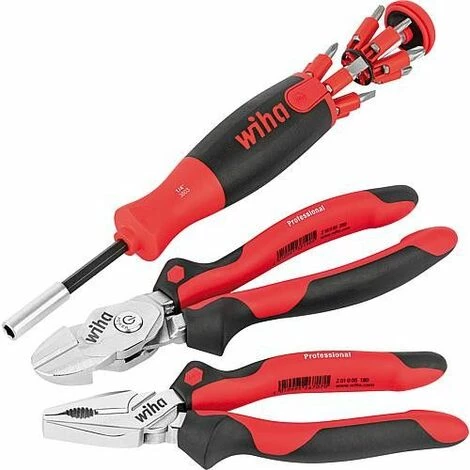 Vous recherchez le produit Set mecanique Wiha 3 piecesSe compose de :Pince coupante diagonale BiCut Professional En acier C70 estampé Taillants trempés par induction jusqu´à 64 HRC Pour découper les différents matériaux des plus souples au plus durs, par ex. câble, clous, vis, boulons, câbles d’acier, fil d’acier à ressort, chaînesFil à piano max.: 3,5/3,0 mm Les coupes sont facilitées de 50 % par simple pression sur le bouton Longueur : 200 mmPince combinée : Acier C70 Taillants trempés par induction jusqu´à 64 HRC Longueur : 180 mmTournevis porte-embouts, magnétique 1/4″ : Acier de chrome-vanadium, entièrement trempé Logement pour 12 embouts de vissage, 25 mm, 1 x embout Phillips de chaque PH1, PH2, PH3, 1 x embout Pozidriv de chaque PZ1, PZ2, PZ3, 1 x emboutTorx® de chaque T15, T20, T25, T30, 1 x embout fente de chaque 4,5 et 6,5 Entraînement : DIN 3126, ISO 1173, forme D 6,3