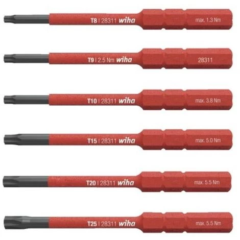 Embouts de vissage isolés 1000VBoîte de 6 embouts slim Torx, isolés 1000 V Lames compatibles avec les tournevis porte-embouts isolés Wiha, se substituent à un jeu de tournevis.Composition:6 embouts slim Torx : T8 -T9 -T10 -T15 -T20 -T25.