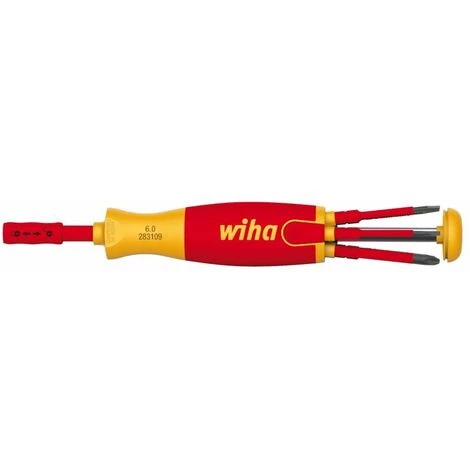 Le tournevis avec boulevardeur de magazine Bit est le compagnon idéal pour chaque électricien d’utilisation mobile. J’ai séjourné dans la poignée de dépôt peut accueillir 6 simbits courants et roule du magazine en appuyant sur un bouton. Cela garantit un retrait facile des bits. Le titulaire de clicfix éprouvé relie toutes les bits en toute sécurité et les verrouille de manière fiable. Cette technologie rend le bitmagazine à un tournevis universellement applicable. Également en termes de sécurité, le porte-bits de magazine offre le maximum possible. Le support de bits de magazine et les éléments minces contenus sont certifiés conformément à la norme internationale IEC 60900. Les slogins minces, de 75 mm de longs de 75 mm offrent un accès parfait à une vis à faible raccord ou à des pinces à ressort à travers l’isolation protectrice intégrée dans le panneau avant. Un autre plus est le capuchon rotatif, qui assure une manipulation confortable. Standards testés selon la CEI 60900. Application adaptée à la vissage dans la gamme de parties en direct jusqu’à 1 000 V CA, en particulier dans l’utilisation mobile. Notez à ne pas utiliser pour les bits de formulaires C 6.3 et E 6.3. Les slogins de 6 mm ne sont utilisés que dans le support de bits SlimVario® et le support de bits VDE Slimtorque (système de couple VDE).