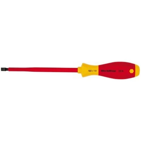 Tournevis plat VDE, Largeur de la lame : 8,0 mm, Épaisseur de la lame 1,6 mm, Longueur de la lame 175 mm, Longueur totale : 299 mm, Ø de la lame : 8,3 mm – Lame ronde – Acier au molybdène chrome-vanadium – Bruni – Poignée multi-composants – Anti-roulement – Empreinte de tête avec symbole d’entraînement et taille – Isolé jusqu’à 1000 V AC et 1500 V DC suivant IEC 60900